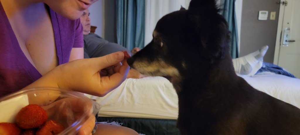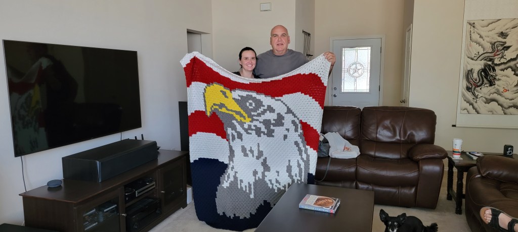 We were able to meet up with our daughter and have an enjoyable couple of days and a really great meal at a local steakhouse and some good TexMex. Princess was able to spend some “sister” time with Beth eating one of her favorites… Strawberries. Beth had worked on this blanket for Brian and had it done for him by the time we arrived. She does beautiful work!! The visit was quick but memorable.
