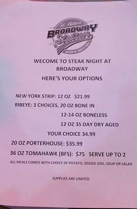 A favorite dinner spot was 10 miles south in St. Hilaire. The bar and off-site Broadway Station. I had called to see if they had breakfast service on Saturday’s. The guy told us “yes we do this week and come on down”. I was shocked to see that a bar was serving breakfast. We went in and picked out a table. We ordered our food and the pancakes were HUGE! The guy who took our order introduced himself to us. His name is Chance. He and his wife are the bar owners. He told us to come back because Saturday nights are Steak Night. He special orders steaks for those nights. This particular night he had just come back from a Ranching Fair. He sampled these exquisite steaks personally and brought some back for Steak Night. We couldn’t turn that down so back we went in the evening. Brian got a Ribeye and I picked out a New York strip. The steaks were incredible! He was so right that they were going to be the best steak ever. He marinated them in garlic and onions before putting them on the grill. We for sure will make it there again before our time at Digikey is over.