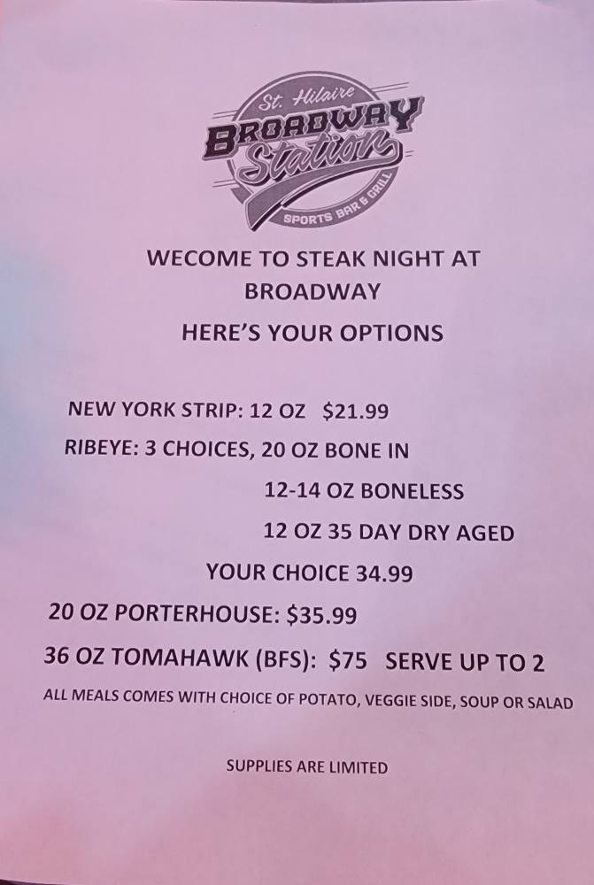 The Broadway Station in St. Hilaire, Minnesota has steak night on Saturday nights. They only put out so many so if you ever want to go make sure you get there early! Call ahead to make sure they have it going on still. Also make sure Chance is the guy at the grill!