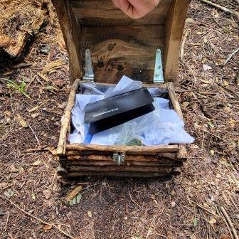 About half way through the walk Brian noticed a little log cabin style box nestled back in off the trail. We walked over to investigate and found it was a geocache box. For those who do not know what a geocache is, here is a brief explanation found on https://gisgeography.com/what-is-geocaching/