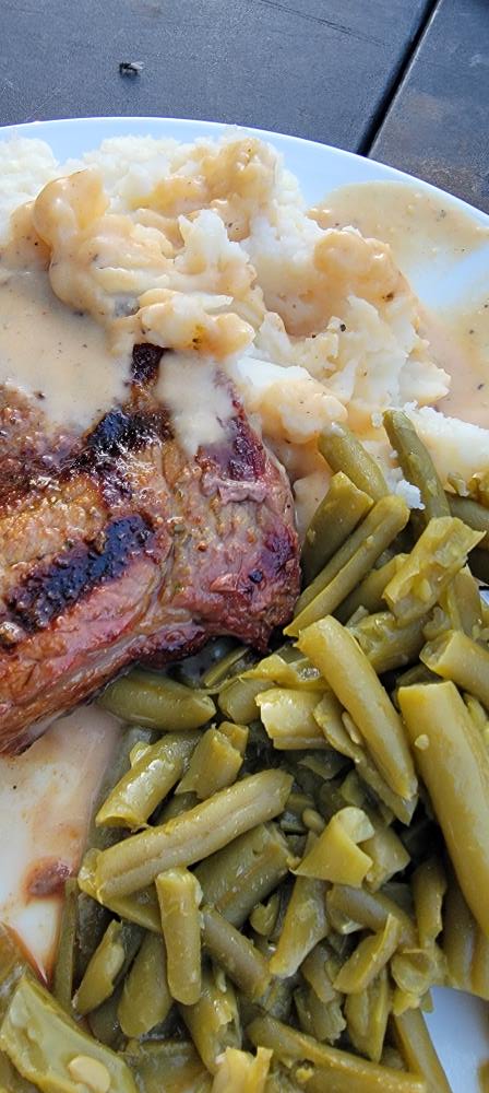 (Steak, Green Beans, Mashed Potatoes with homemade Gravy that our friend Lucas made)