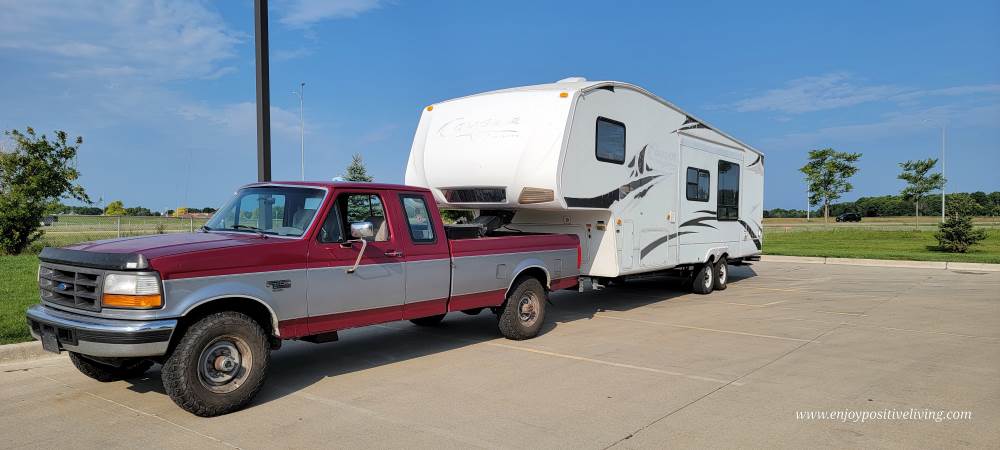 On the road again and things were going smooth until we tried checking into a state park in Iowa. Do not believe when a state park says they can accommodate you. The park outside Sioux City, IA website said sure you can bring in a 32′ 5th wheel. No you can’t! Positive note, we stayed in a hotel that had great water pressure for a long shower!