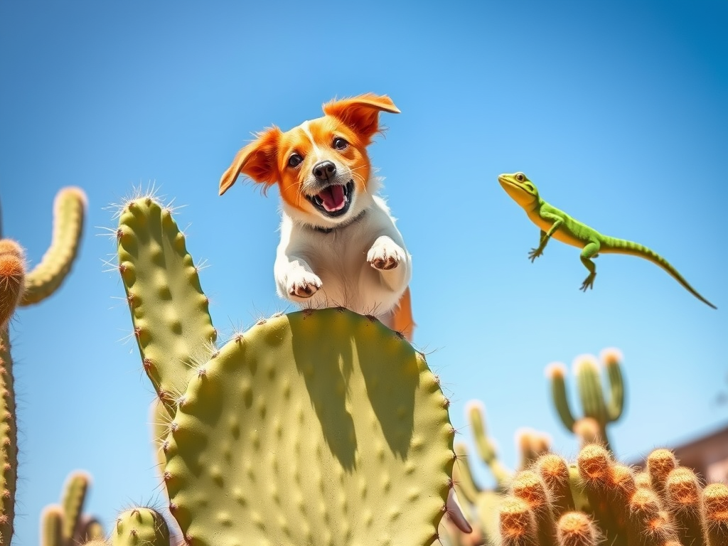 Marco without hesitation took a leap over the cactus and down the other side not quite clearing the whole outer paddles. That stopped him pretty fast! I got to him and picked him up covering both of us in little hair like tines of cactus. I got him back into the shack to assess what the damages were.